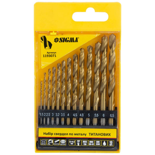 Набір свердел по металу HSS-TiN титанових 13шт 1.5-6.5мм (пласт кейс) SIGMA (1193071) Свердло по металу призначено для отримання наскрізних і глухих отворів в заготовках. Використовують для переривчастого різання при невисоких навантаженнях. Покриття нітридом титану підвищує твердість поверхневого шару виробу і його термостійкість, надає додаткову міцність і опір перегріву. Дозволяє знизити тертя під час роботи. Призначено для обробки легких металів, сталі, алюмінію, пластику, деревини. Для свердел діаметром понад 10 мм зроблена проточка хвостовика діаметром 10 мм та довжиною 30 мм під стандартний патрон. При роботі рекомендується використання змащувально-охолоджуючих рідин.