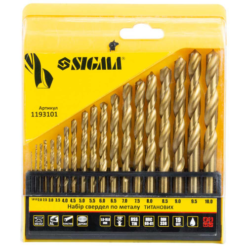 Набір свердел по металу HSS-TiN титанових 19 шт 1.0-10.0мм (пласт кейс) SIGMA (1193101) Свердло по металу призначено для отримання наскрізних і глухих отворів в заготовках. Використовують для переривчастого різання при невисоких навантаженнях. Покриття нітридом титану підвищує твердість поверхневого шару виробу і його термостійкість, надає додаткову міцність і опір перегріву. Дозволяє знизити тертя під час роботи. Призначено для обробки легких металів, сталі, алюмінію, пластику, деревини. Для свердел діаметром понад 10 мм зроблена проточка хвостовика діаметром 10 мм та довжиною 30 мм під стандартний патрон. При роботі рекомендується використання змащувально-охолоджуючих рідин.