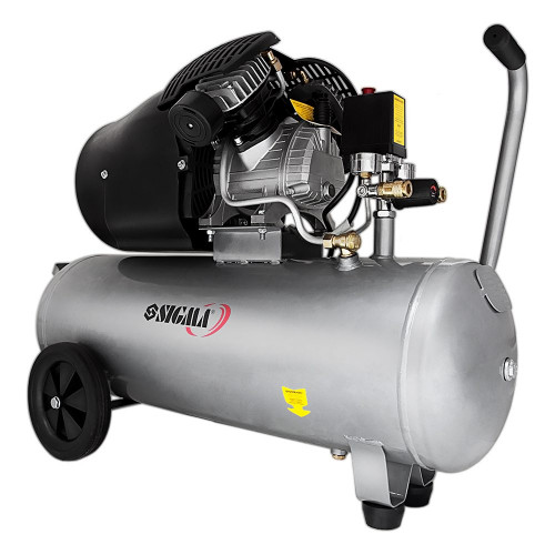 Компресор двоциліндровий (V) 2.5кВт 455л/хв 10бар 50л (2 крана) SIGMA (7043721) призначений для нагнітання стисненого повітря з подальшою його подачею під тиском в різні типи пневмоінструменту і пневмообладнання. Двигун компресора закритий спеціальним кожухом, який запобігає його пошкодження і забруднення. Опорна ніжка забезпечує стійке положення на поверхні, а гумова подушечка знижує рівень вібрації. Модель компресора Sigma 7043721 має потужність 2.5 кВт і великою продуктивністю 455 л/хв з високим тиском (до 10 бар). Застосовується в будівництві і невеликому виробництві, на СТО і майстерень. Ресивер місткістю 50 л дозволяє накопичувати більший обсяг стисненого повітря, що значно зменшує частоту включення двигуна, знижуючи навантаження на компресор і, відповідно, збільшує термін його служби.